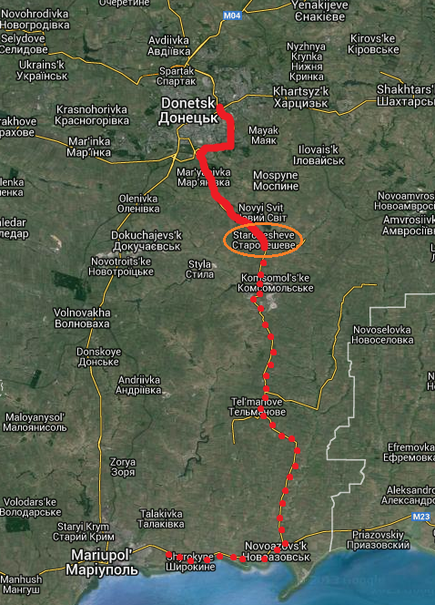 Also in this context, the massive Russian military column that was seen yesterday and described above could indeed by the Battalion-size force which is to take Mariupol and the surrounding areas in the weeks and months to come. Although, there is a massive Ukrainian army force west of Donetsk, Russian invaders could have realized that they can rely on Poroshenko’s word and he won’t start any counterattack, no matter what. Knowing this, Russia could have decided to redeploy several hundred troops plus a mighty apc/tank/artillery force to the south to extend its controlled territory on the northern coast of the Sea of Azov.